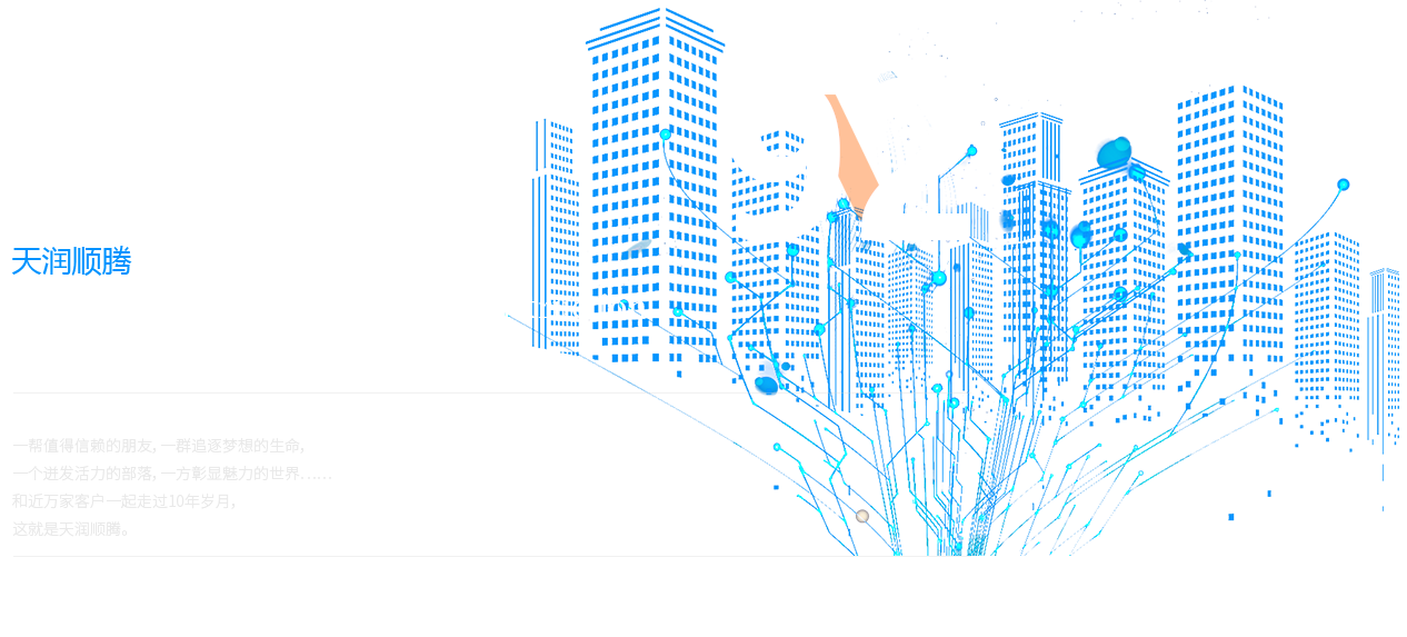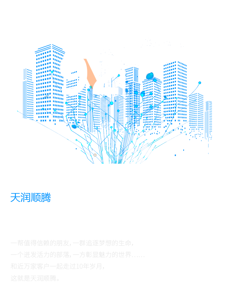 一幫值得信賴(lài)的朋友,一群追逐夢(mèng)想的生命, 一個(gè)迸發(fā)活力的部落,一方彰顯魅力的世界…… 和近萬(wàn)家客戶一起走過(guò)10年歲月, 這就是天潤(rùn)順騰。